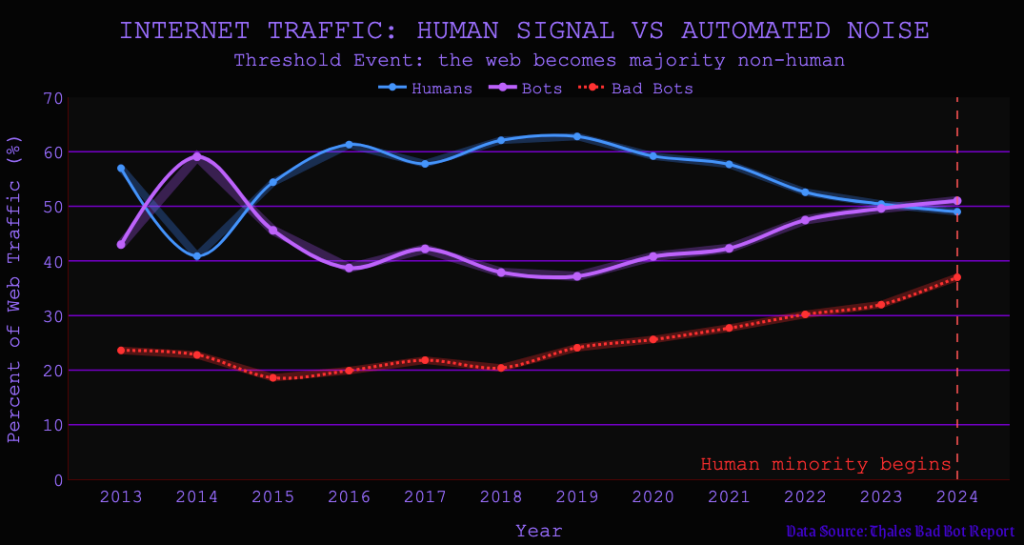 Human usage of the web was actually growing into the mid-2010's, in part because more people were connecting all over the world for the first time. At the same time, the early dot-com boom had long since faded, and the crashes in 2001 and 2008 had left people looking for new opportunities to exploit the web and its human users. Social media was taking off, but with it came a new phenomena: bots. These "bot" users scraped people's data and looked for potential hacks and exploits, much like the hackers of the 80's and 90's, but now with more automation. The bots were not necessarily bad -- some collected useful data, or gathered statistics to help make the web safer. But others were used to attack websites. And over time, a bigger problem emerged: bots that began impersonating humans. Why? To drive fake traffic to website and influencer accounts, for one, and to manipulate users by driving certain narratives to the top of people's feeds. As of 2025, bots officially surpassed human users on the web.